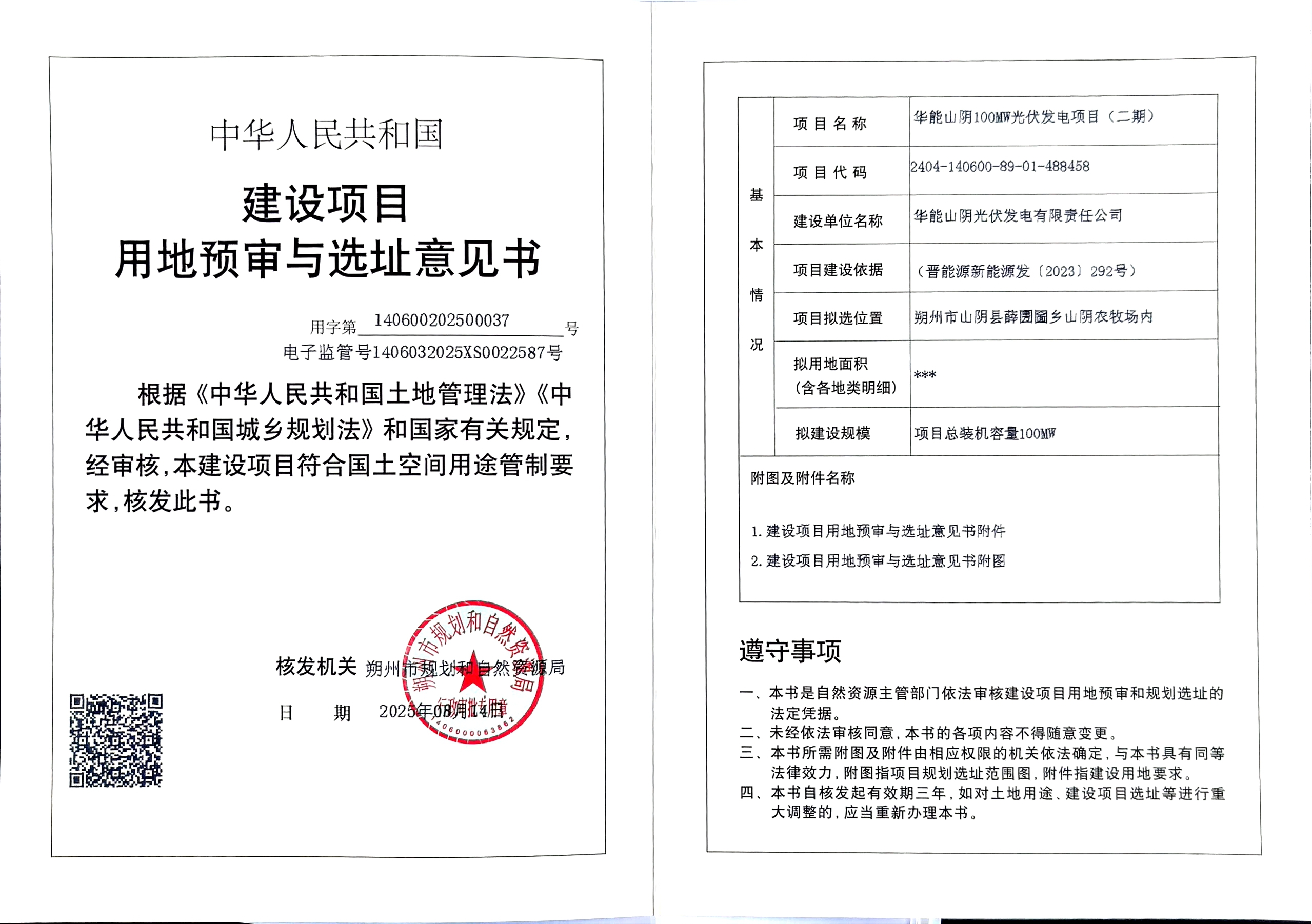 华能山阴100MW光伏发电项目(二期)建设项目用地预审与选址意见书