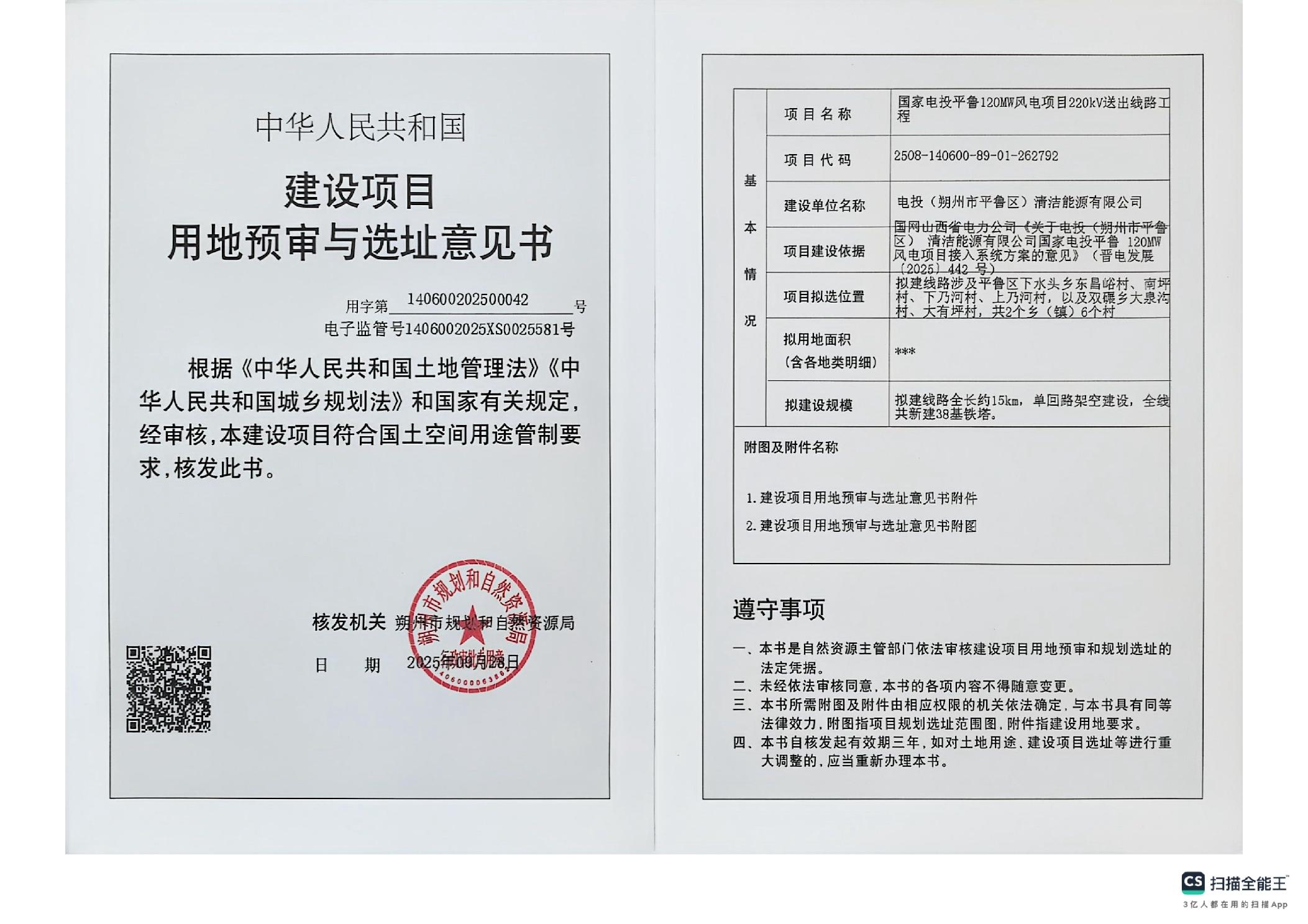 国家电投平鲁120MW风电项目220kV送出线路工程建设项目用地预审与选址意见书